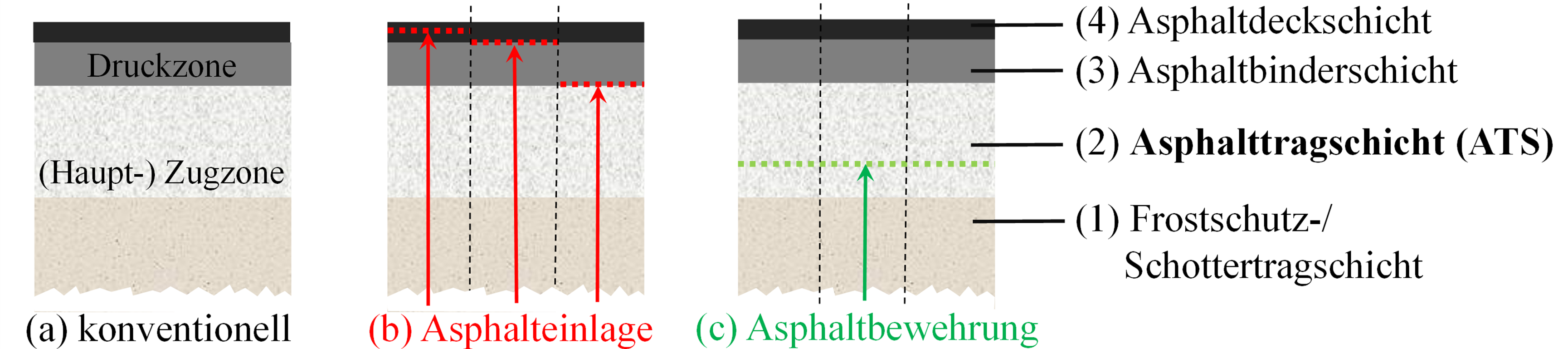 Der klassische Asphaltaufbau besteht aus mehreren Schichten: Deckschicht, Binderschicht, Asphalttragschicht und der darunterliegenden Schotter- oder Frostschutzschicht (s. Abb. 1). Entscheidend für die Lebensdauer ist dabei die Asphalttragschicht (ATS). Sie trägt die Hauptlast und ist besonders empfindlich gegenüber Zugspannungen, die durch Verkehr und Temperaturwechsel entstehen. Wenn in der unteren Zone der ATS erste Risse auftreten, breiten sich diese mit der Zeit nach oben aus – bis der gesamte Straßenkörper saniert werden muss.