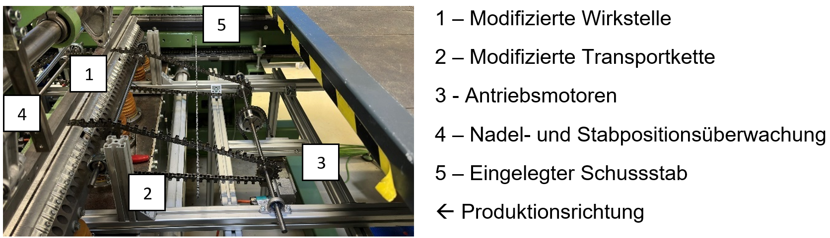 Für die Schussstabzuführung wurde eine neue, modular erweiterbare und parametrisierbare Steuerung entwickelt, die eine auf die Nadelstellung abgestimmte Stabzuführung positions- und zeitgenau ermöglicht. Die Herausforderung liegt insbesondere darin, dass der kollisionsfreie Arbeitsbereich bei lediglich 10 % des Maschenbildungsvorganges liegt, 90 % des Vorganges ist die Nadel im Wirkbereich vorhanden. Zur Realisierung der kollisionsfreien Stabzuführung liegt die Innovation in einem intervallbasierten, rampenartigen Bewegungsverlauf mit abschnittsweise beschleunigter und verzögerter Transportgeschwindigkeit (variabel zwischen 1/4 der Produktionsgeschwindigkeit kurz vor und nach der Maschenbildung und bis zu 4-fache Produktionsgeschwindigkeit für die sprunghafte Durchführung im kollisionsfreien Arbeitsbereich der abgetauchten Nadel) der modular nachträglich integrierbaren Transportkette, die den Stab führt, fixiert und kollisions- sowie kippfrei durch die Wirkstelle transportiert. Durch den sprunghaften Geschwindigkeitsanstieg wird der Stabtransport von mind. 5 mm Länge innerhalb des zur Verfügung stehenden Arbeitsfensters (lediglich 10 %) realisiert. Hierbei müssen die kontinuierliche Wirkfadenzuführung und Abzugsgeschwindigkeit auf die intervallweise und quasi-diskontinuierliche Stabtransportgeschwindigkeit aufeinander abgestimmt sein, um eine stabile und gleichmäßige Maschenstruktur zu gewährleisten. Hierzu empfiehlt sich eine Einzelfadenzuführung elastischer Garne für die Maschenbildung mit hohem Arbeitsbereich für stark variierende Fadenzugkräfte aufgrund der quasi-diskontinuierlichen Arbeitsweise und des hohen Lagenaufbaus. Zudem wurden systembedingte Korrekturfaktoren identifiziert und iterativ angepasst, die u. a. die Trägheit und Dehnung des Transportsystems (mechanisch und motorisch) berücksichtigt. Eine optische Positionsüberwachung der Stablage (bspw. Schräglage) kann bei Verwendung von Einzelantrieben der beiden Transportkettenseiten eine inline-Korrektur gewährleisten, wobei auch mechanische Zwangsläufe mit Not-Stopp-Funktion bei Ermittlung einer Falschlage möglich sind. In Hinblick auf eine hohe Produktivität werden inline-Korrekturmöglichkeiten favorisiert.