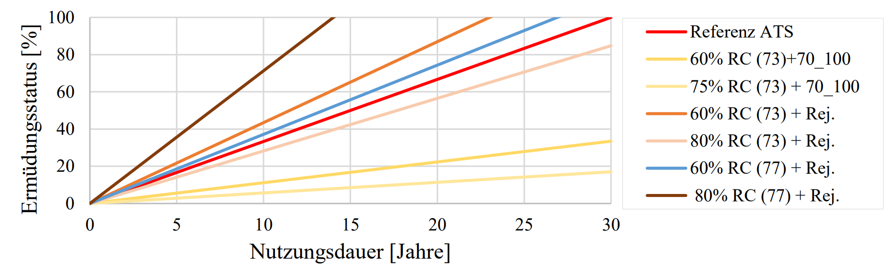 Die Ergebnisse zeigten, dass natürliche Rejuvenatoren (Rej.) die Tränkung der Carbonfasern angreifen und die mechanische Festigkeit der Garne deutlich reduzieren. Dagegen führte ein erdölbasierter Rejuvenator zu einem stabilen Verbund und einem sehr guten Ermüdungsverhalten. Die besten Ergebnisse erzielten Asphalte mit 80 % RC-Anteil und erdölstämmigem Rejuvenator – sie erreichten eine mehr als doppelte Nutzungsdauer als herkömmliche Asphalttragschichten für die definierten Belastungsszenarien (s. Abb. 3)