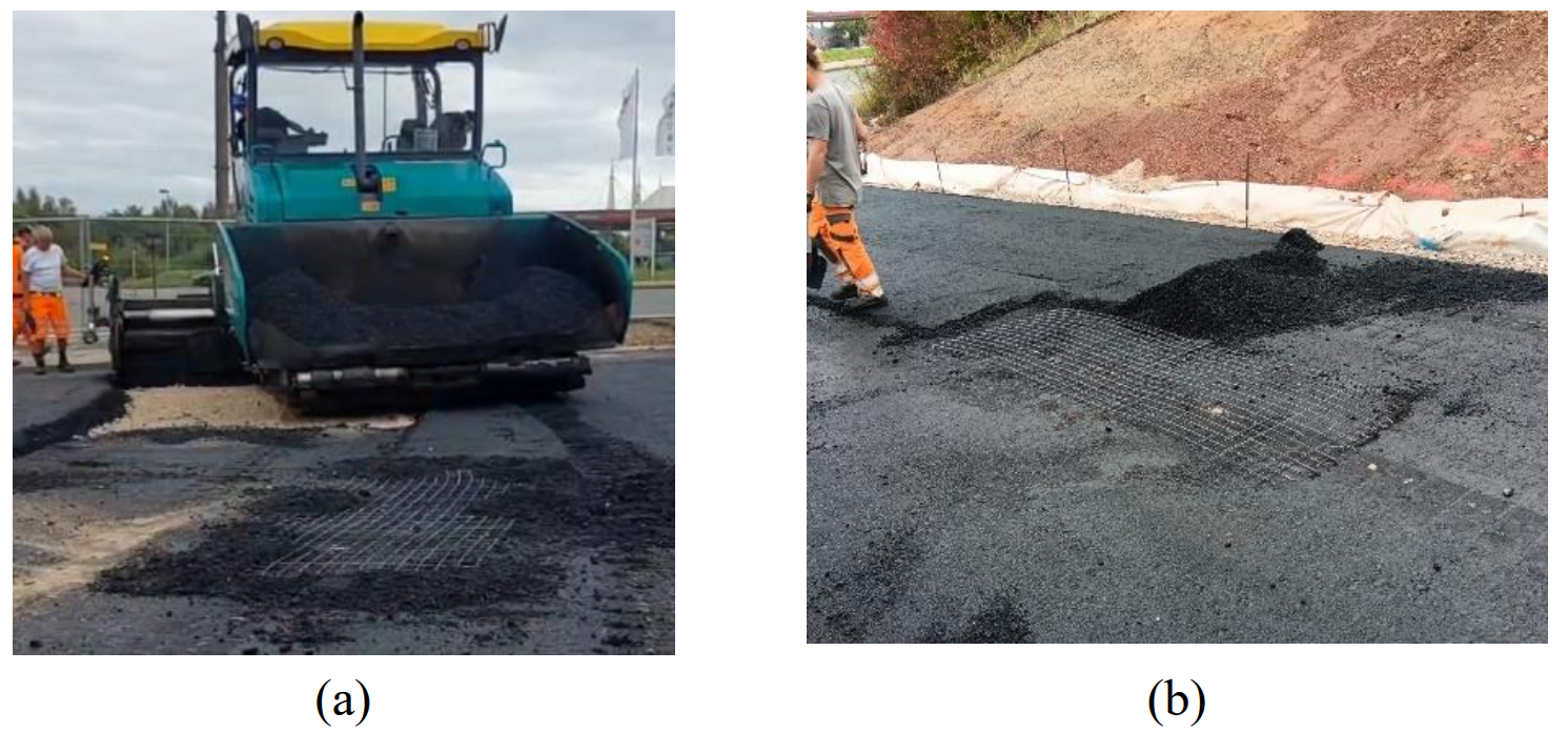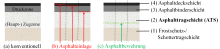 Ein wichtiger Schwerpunkt war die Einbindung der Bewehrung in den Asphaltaufbau. In Laborversuchen und einer Demonstratoranwendung (s. Abb. 4) wurden verschiedene Einbauverfahren getestet. Dabei zeigte sich, dass nur der Heiß-auf-Heiß-Einbau (Einbau der Asphaltbewehrung zwischen zwei heißen Asphalttragschichten) einen dauerhaft guten Schichtenverbund ohne Fehlstellen gewährleistet.