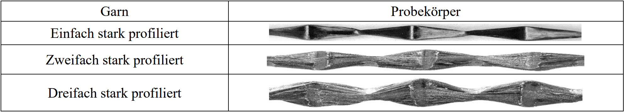 Am ITM der TU Dresden wurden mittels der patentierten Tränkumformtechnik völlig neue profilierte Carbonfaser-Mehrfachgarne entwickelt, die aufgrund einer materialgerechten Umformung bei Erhalt des durchgängigen Carbonfilamentverlaufes eine außergewöhnlich hohe Zugsteifigkeit (E-Modul ≥ 180 GPa) und Festigkeit (≥ 2.500 MPa) aufweisen (s. Tab. 1).