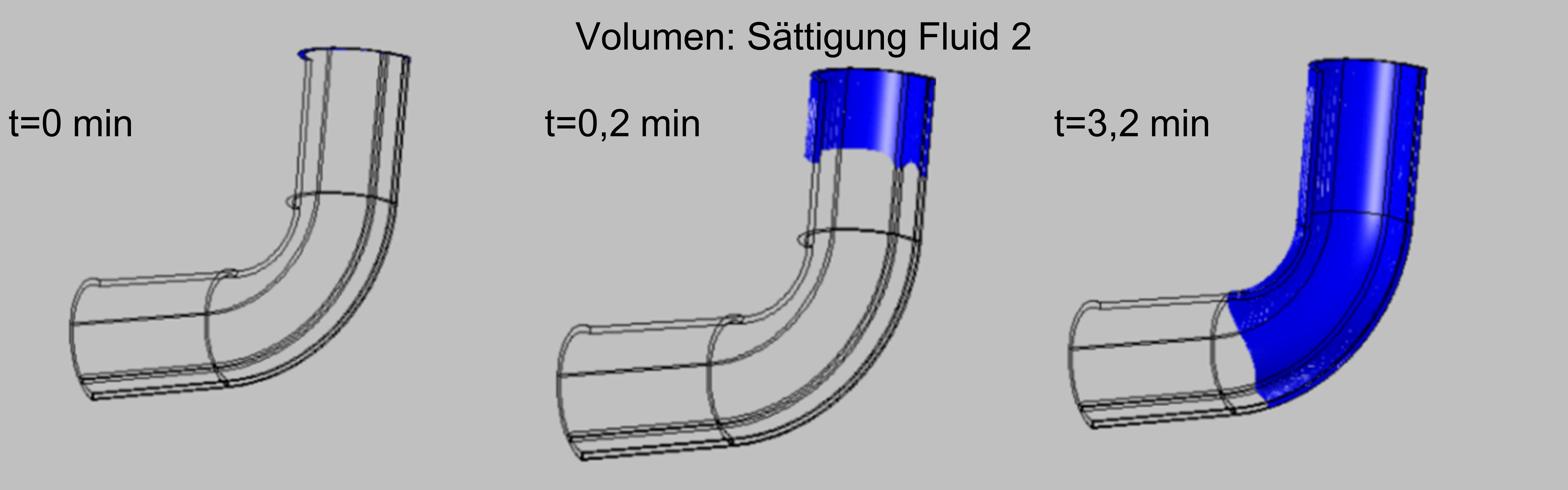 Abbildung 2 zeigt die zeitabhängige Sättigung des Fluids in einer numerischen Simulation des Harzflusses während des Infusionsprozesses in einem dreidimensionalen porösen Medium in Form eines Rohrbogens mit integriertem HFK. Die HFK sind regelmäßig entlang der Bauteilkontur angeordnet. In der Darstellung kennzeichnen blaue Bereiche die harzgesättigten Zonen, während weiße Bereiche luftgefüllte Regionen repräsentieren. Die initiale Harzinfiltration ist ringförmig im Bereich des Einlasses erkennbar. Im weiteren Prozessverlauf breitet sich das Harz entlang der gekrümmten Geometrie aus und infiltriert sukzessive größere Bereiche der Struktur. Die Darstellung verdeutlicht zunächst eine ungleichmäßige Entwicklung der Fließfront, die auf die längeren Fließwege im äußeren Rohrbogen zurückzuführen ist. Durch den Einsatz der HFK wird jedoch die lokale Permeabilität erhöht, wodurch der Infusionsprozess beschleunigt und die Durchtränkung der 3D-gekrümmten Struktur verbessert wird. Eine gezielte Platzierung der Fließkanäle ermöglicht zudem eine weitere Homogenisierung der Fließfront, was zu einer erhöhten Bauteilqualität des Verbundwerkstoffs führt.