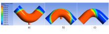 Abbildung 1 zeigt drei numerische Simulationsergebnisse einer des Harzflusses während des Infusionsprozesses in einem dreidimensional porösen Medium in Rohrbogengeometrie. Die dargestellten Infusionsstrategien unterscheiden sich hinsichtlich der Angusspositionierung: Strategie (a) und (b) verwenden eine punktförmige Injektion am inneren bzw. äußeren Rohrbogen. Beide Varianten führen zu asymmetrischen Fließfrontverläufen, wobei sich die Fließfronten am Bauteilende vereinigen. Im Gegensatz dazu ermöglicht die Strategie (c) mit ringförmiger Injektion eine gleichmäßigere und stabilere Fließfront, reduziert lokale Druckgradienten und erlaubt durch den Einsatz von Harzfließkanälen (HFK) eine robuste Prozessführung, weshalb sie als bevorzugte Infusionsstrategie für die Fertigung der 3D-gekrümmten FKV-Struktur gewählt wurde.