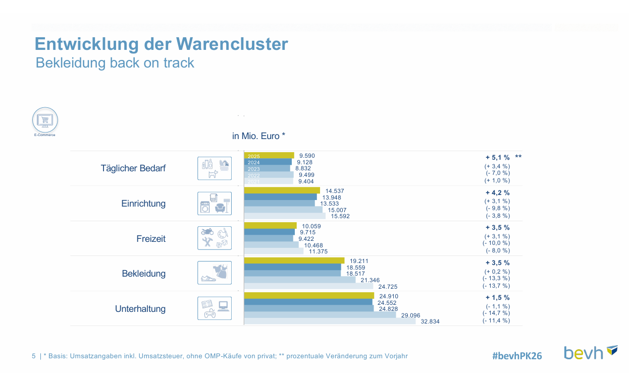 Im Verlauf des Jahres 2026 erwarten der bevh und das EHI Retail Institute in einer gemeinsamen Prognose, dass die Branche trotz schwieriger Rahmenbedingungen weiter überdurchschnittlich wächst und ein (nominales) Umsatzwachstum im E-Commerce mit Waren von 3,8 Prozent erreicht.