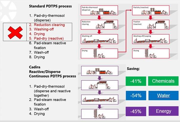 Cadira Reactive/Disperse Continuous is a modified pad-dry-thermosol-pad-steam dyeing process for open width PET/CO fabrics. In contrast to the standard pad-drythermosol-pad-steam process (PDTPS) process, Cadira does not require a separate reduction clearing process and thus saves more than 40% chemicals, water and energy. This effect is obtained by using a special dye choice of Dianix XF/XF2 and SF disperse dyes in combination with selected Levafix and Remazol reactive dyes and a modified steaming and wash-off process with Sera auxiliaries.