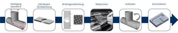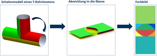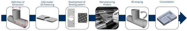 The complete manufacturing process (Figure 1) of an integrally woven pipe joint begins with the definition of the target geometry, including diameter, wall thickness, pipe lengths, and branching angle. Based on these parameters, a CAD model of the final geometry is created. The surfaces defined in the model are then flattened into the plane, taking into account the required layer architecture, in order to generate a colour-coded image from the developed surfaces.
