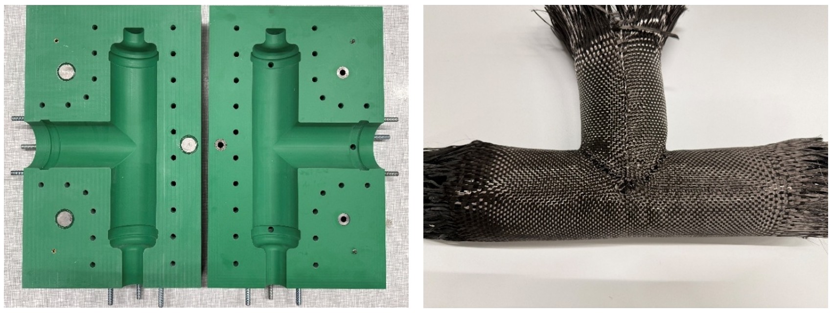 Since the warp yarn loops in the first section of the fabric remain floating up to the edge of the oval region, the corresponding warp yarn excess lengths can be withdrawn. As a result, this warp yarn system is integrated into only one half of the woven structure within the pipe joint. After the preform has been shaped into its three-dimensional configuration, consolidation is carried out. An RTM tool specifically adapted to the contour of the flow-through pipe joint was designed and manufactured (Figure 5). The result after consolidation is a fully consolidated T-joint for media transport with high surface quality and reproducible geometric accuracy.