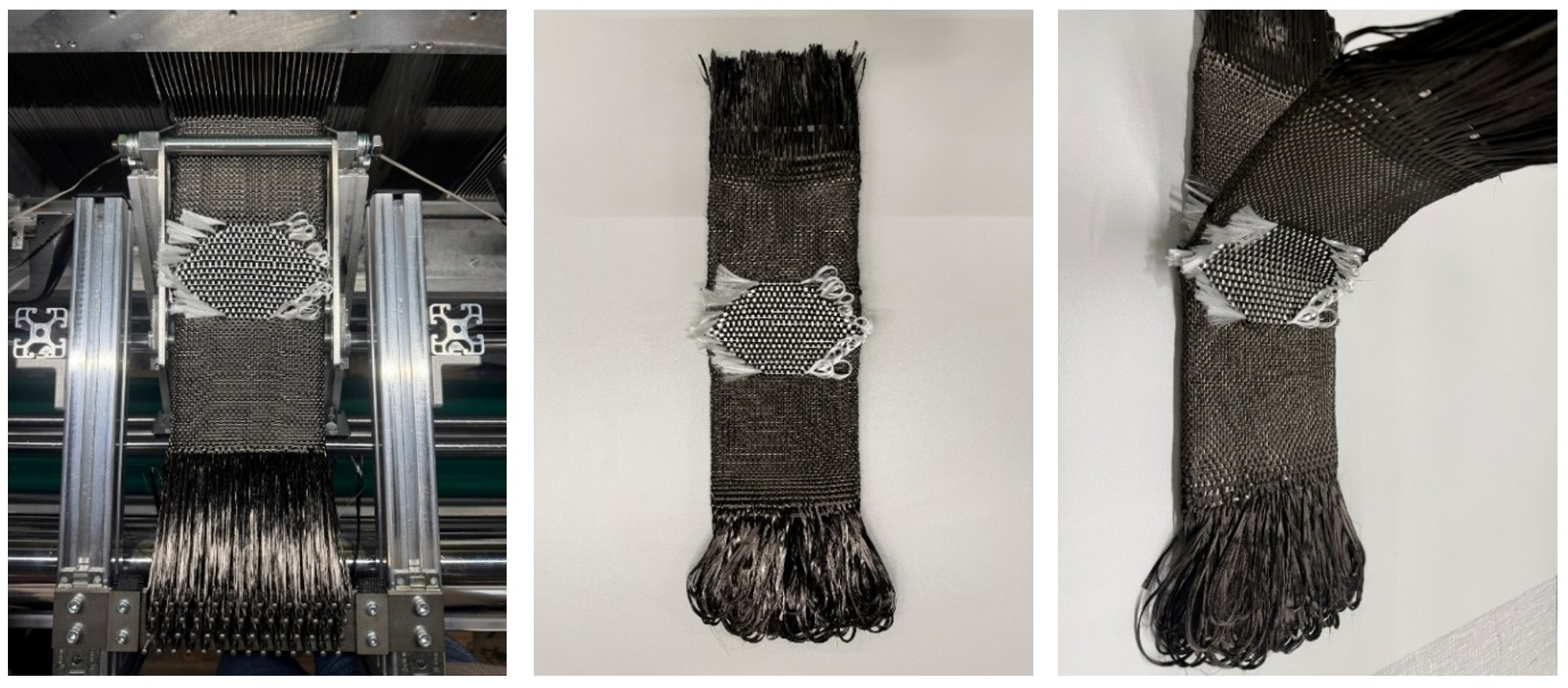 For the reproducible production of this highly complex weave architecture, uniform weft insertion is essential. In particular, during the fabrication of the oval region, the weft yarns must reverse within the fabric structure rather than being inserted across the full fabric width, as is typical in conventional weft insertion. The precision of this process step significantly influences both the quality of the three-dimensional pipe joint geometry and the quality of matrix infiltration during consolidation. The textile preforms were successfully manufactured (Figure 4).